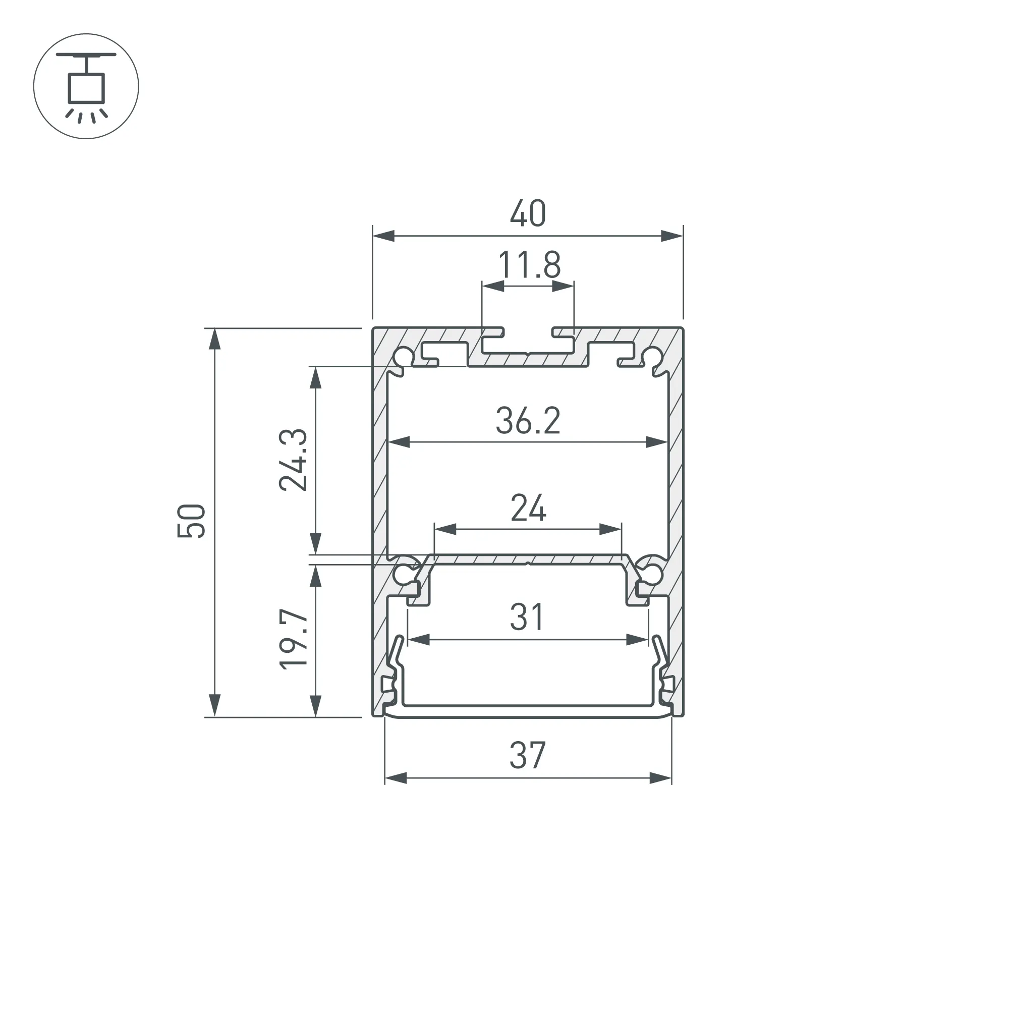 Алюминиевый анодированный профиль для светодиодных лент и линеек с возможностью герметизации до IP65. Цвет - серебристый. Габаритные размеры профиля (L×W×H): 2000x40x50 мм. Ширина площадки для ленты 24 мм. Экраны, заглушки и другие аксессуары приобретаются отдельно. Цена за 1 метр.